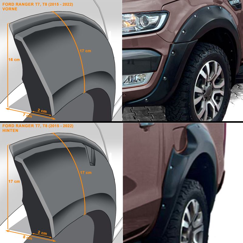 Need poritiiva laiendid mitte ainult ei anna teie Ranger T7 T8 mudelile (2015-2022) silmatorkavat välimust, vaid pakuvad ka kerele täiendavat kaitset. Laiusega umbes 4,5 cm külje kohta (kokku 9 cm) on piisavalt ruumi suurematele rehvidele, samal ajal vähendades kriimustusi ja kivikilde.